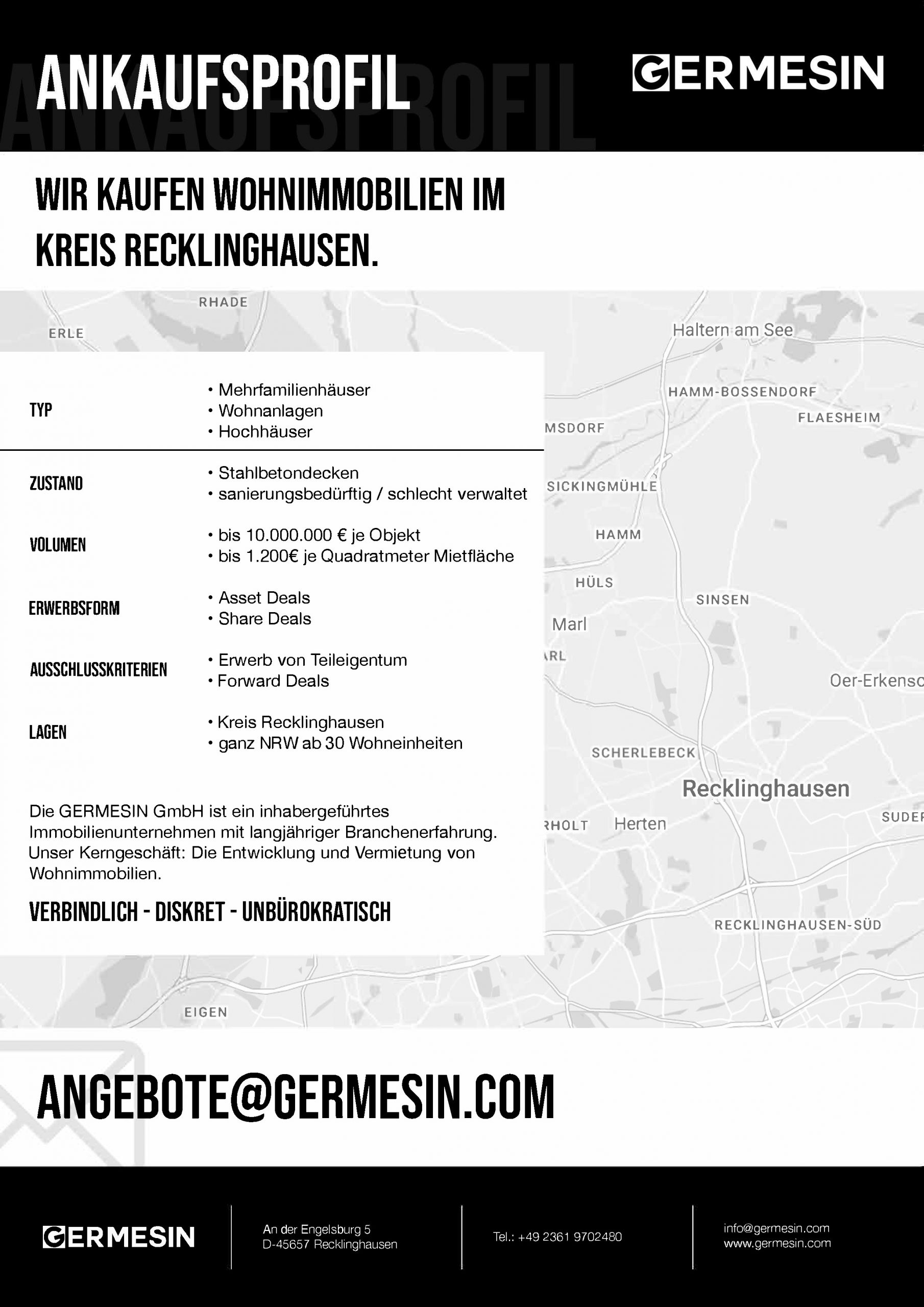 Wir suchen fortlaufend nach Objekten im Kreis Recklinghausen und ganz NRW. Lassen Sie uns gerne unverbindlich Ihr Angebot zukommen, wir sagen Ihnen bereits jetzt eine kurzfristige Prüfung zu. Weitere Informationen finden Sie in unserem Ankaufsprofil.